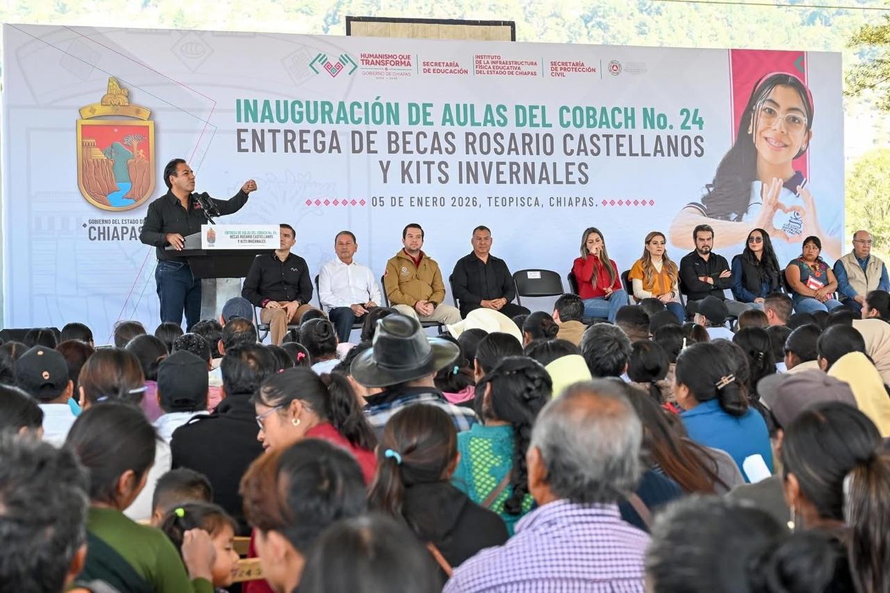 En otro momento, durante una visita al municipio de Teopisca, el gobernador inauguró espacios educativos en el Colegio de Bachilleres de Chiapas (Cobach), Plantel 24, además de entregar becas de alfabetización Rosario Castellanos y kits invernales en beneficio de familias en situación de vulnerabilidad. Señaló que estas acciones forman parte de un gobierno humanista que atiende de manera prioritaria las necesidades de la población y reafirmó su compromiso de gobernar con humildad, honestidad, autoridad moral y en unidad con el pueblo.